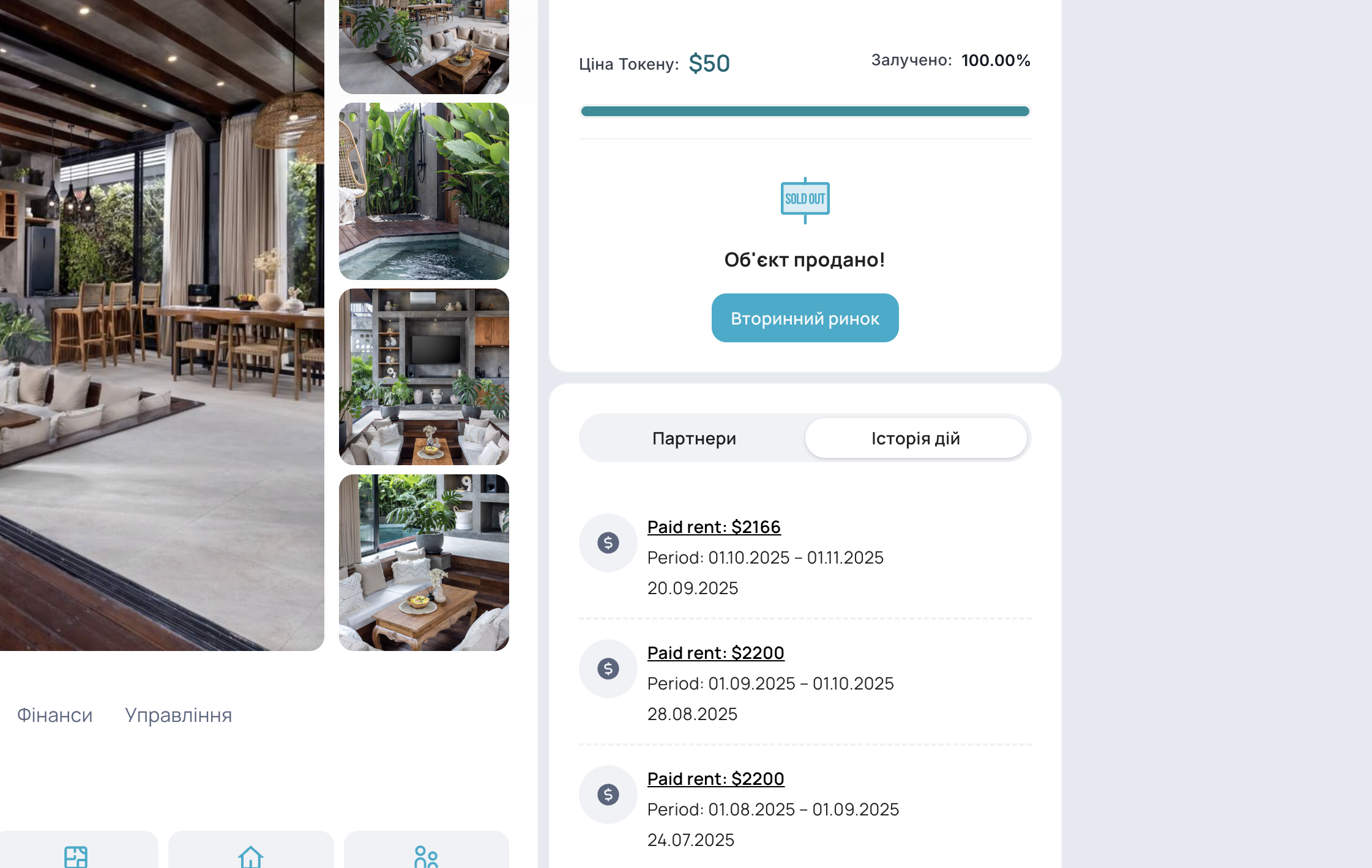 A property worth $350,000 is divided into thousands of tokens. You buy tokens at an affordable price (for example, from $30.7). You get the right to a share of the rental income, the right to democratically decide the fate of your property together with other co-owners, and you can sell tokens to other investors.