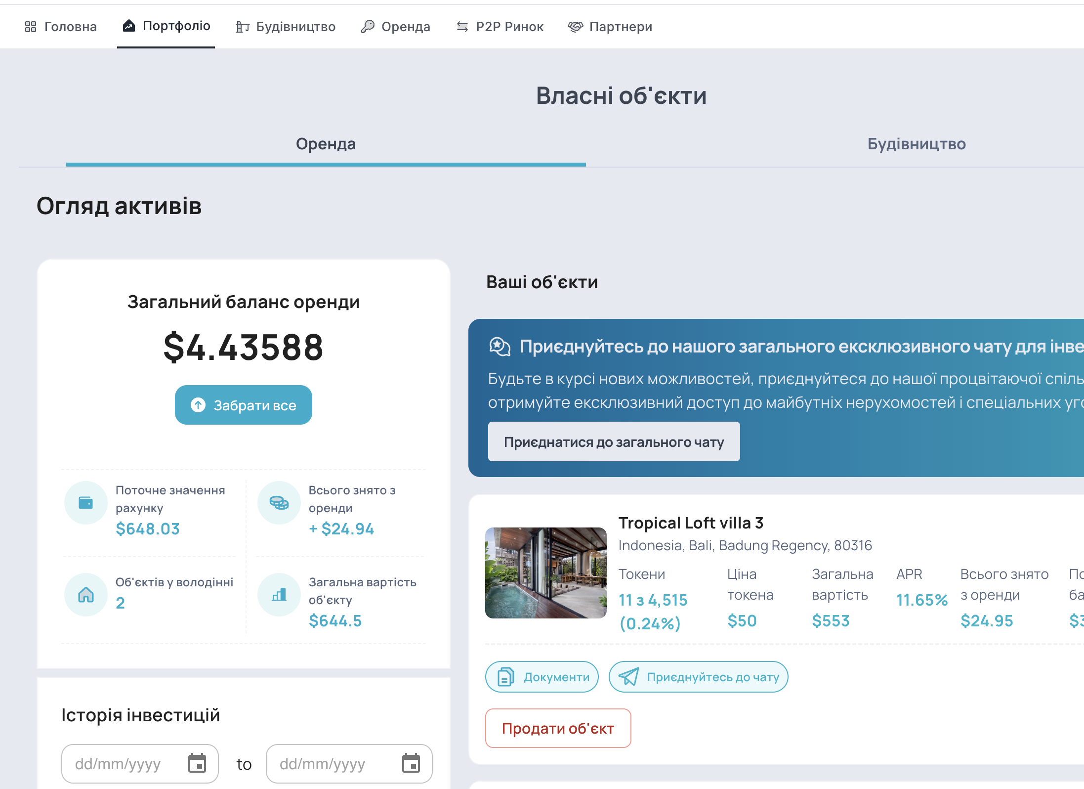 After the complete sale of any property in the primary market section, you can exit at any time, if necessary, through the P2P market.